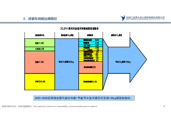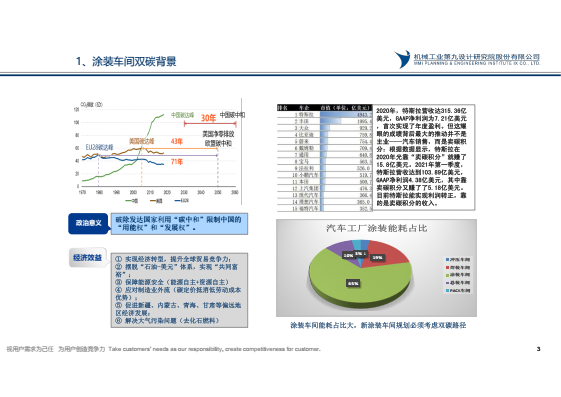 國務院2021年10月24日頒布《2030年前碳達峰行動方案》,到2025年,非化石能源消費比例達到20%左右,單位國內生產總值能源消耗比2020年下降13.5%,單位國內生產總值二氧化碳排放比2020 年下降18%,目前汽車涂裝車間化石能源消費比約占80%,碳排放約占汽車工廠65%,汽車工廠實現碳達峰,涂裝需先行。