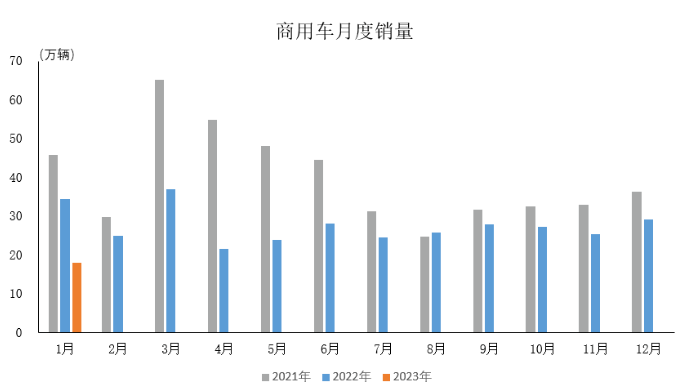 2023年1月,商用車產銷分別完成19.7萬輛和18萬輛,環比分別下降23.9%和38.1%,同比分別下降43.1%和47.7%。