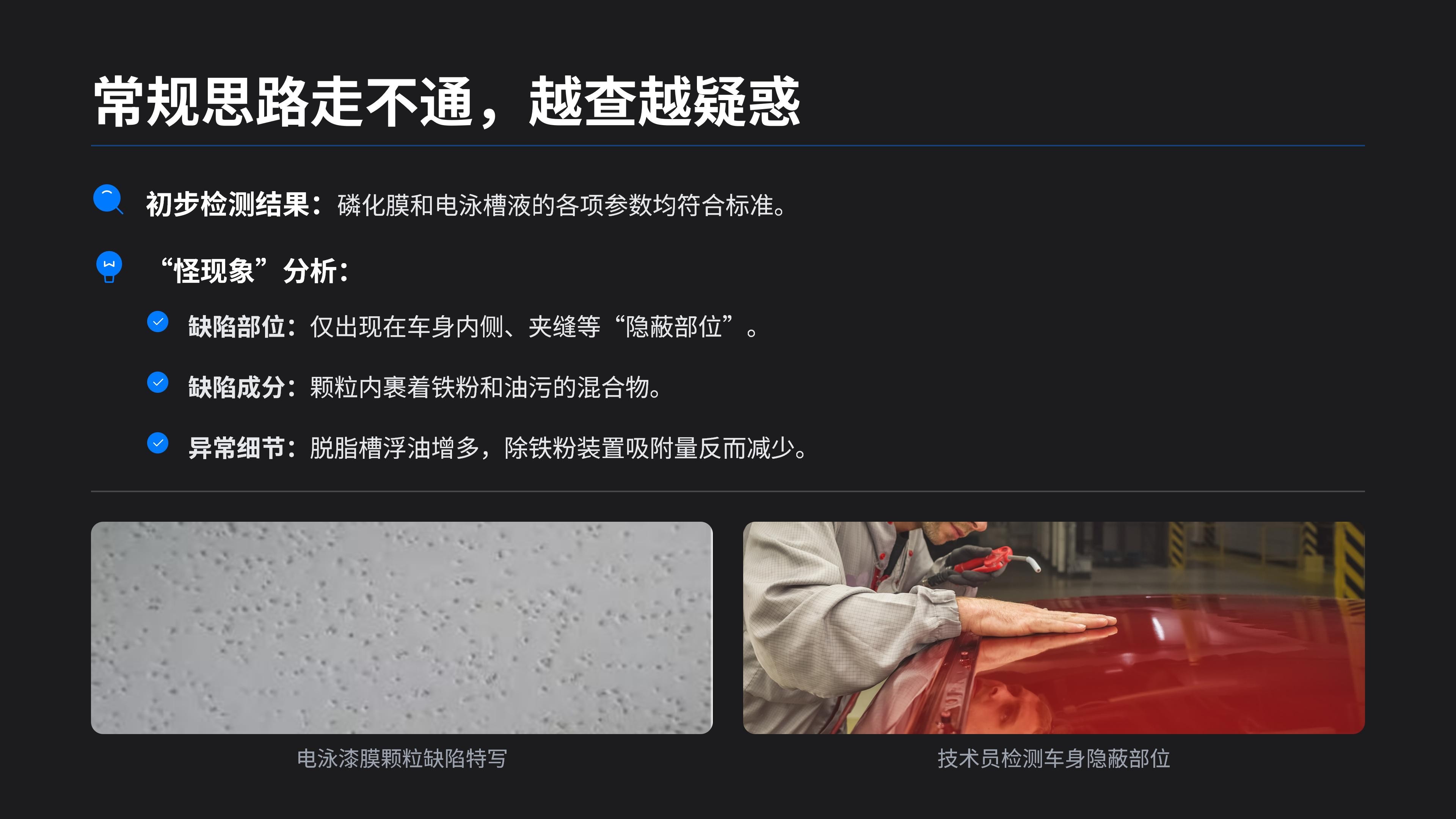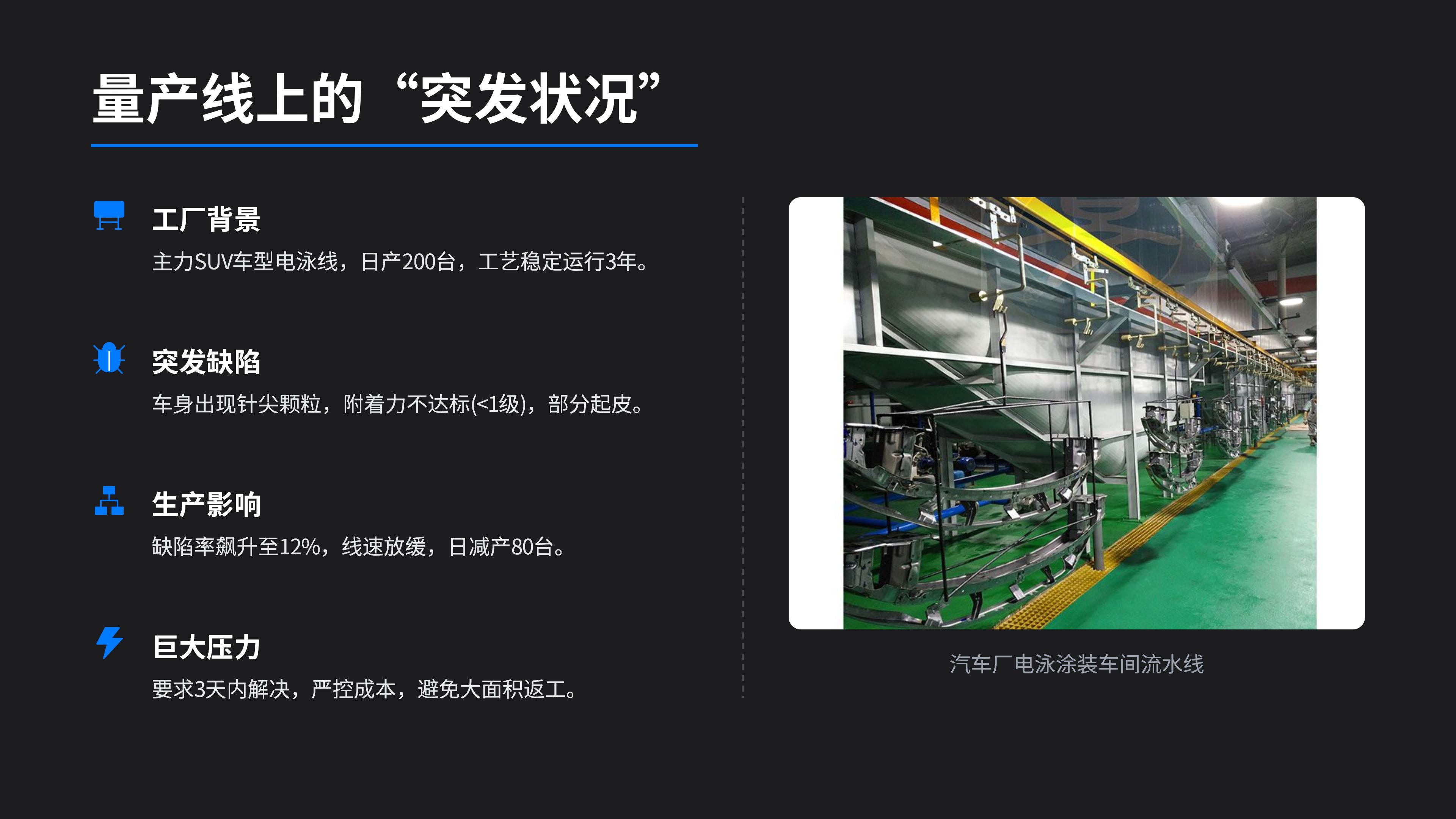 涂裝部門急得跳腳,要求 3 天內必須解決 —— 既不能增加額外成本,也不能大面積返工,畢竟一臺車身返工成本就得 2000 多,還耽誤交付。當時車間的技術員排查了 2 天,調了磷化槽的游離酸、補了表調劑,甚至換了一批電泳漆,缺陷率還是沒降下來,大家都有點慌了。