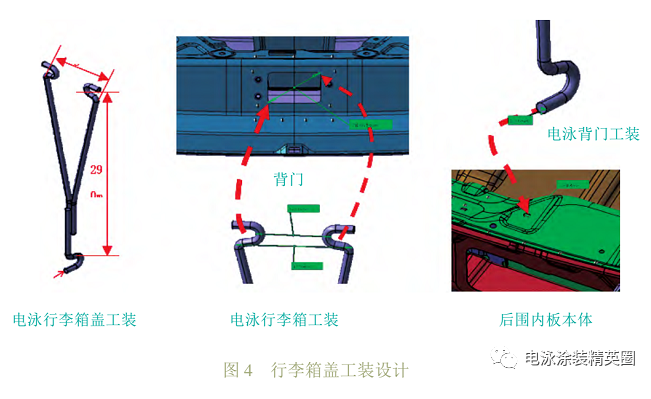 涂裝輔助工裝的作用,就是要確保四門兩蓋噴涂油漆后濕膜狀態下不與車身產生接觸碰撞,輔助工裝支撐位置要求在整車覆蓋面,避免漆膜在濕膜狀態下碰傷而造成返修。