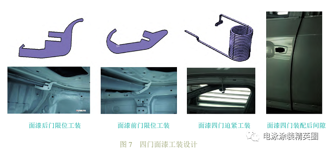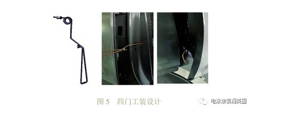 涂裝輔助工裝通常分為前處理電泳工裝和面漆工裝兩種;前處理電泳輔助工裝為限位夾緊類,面漆輔助工裝為支撐類;安裝固定在車身四門、前艙蓋、行李箱蓋位置。