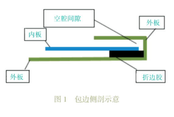 汽車車身的五門一蓋的包邊結構基本一致,都是由于外板、內板和折邊膠三者構成,外板包裹著內板和折邊膠,三者相互作用形成空腔,空腔的大小由三者共同決定。