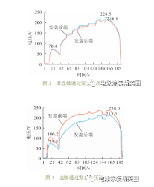 利用表面流動電位測試儀(俗稱潛水艇)對車身各個部位實際電壓進行監測(圖2 -3)。測量發現:當非連續通過時發蓋前后電壓無明顯差異,但連續通過時到達車身的最大電壓前部高于后部 15 - 25 V。車身剛入槽低壓段實際到達車身的電壓前端與后端壓差達到30V(前部電壓106.2 V。后部電壓 73.9 V)。說明前一臺車對后一臺車電泳電壓有較大影響。